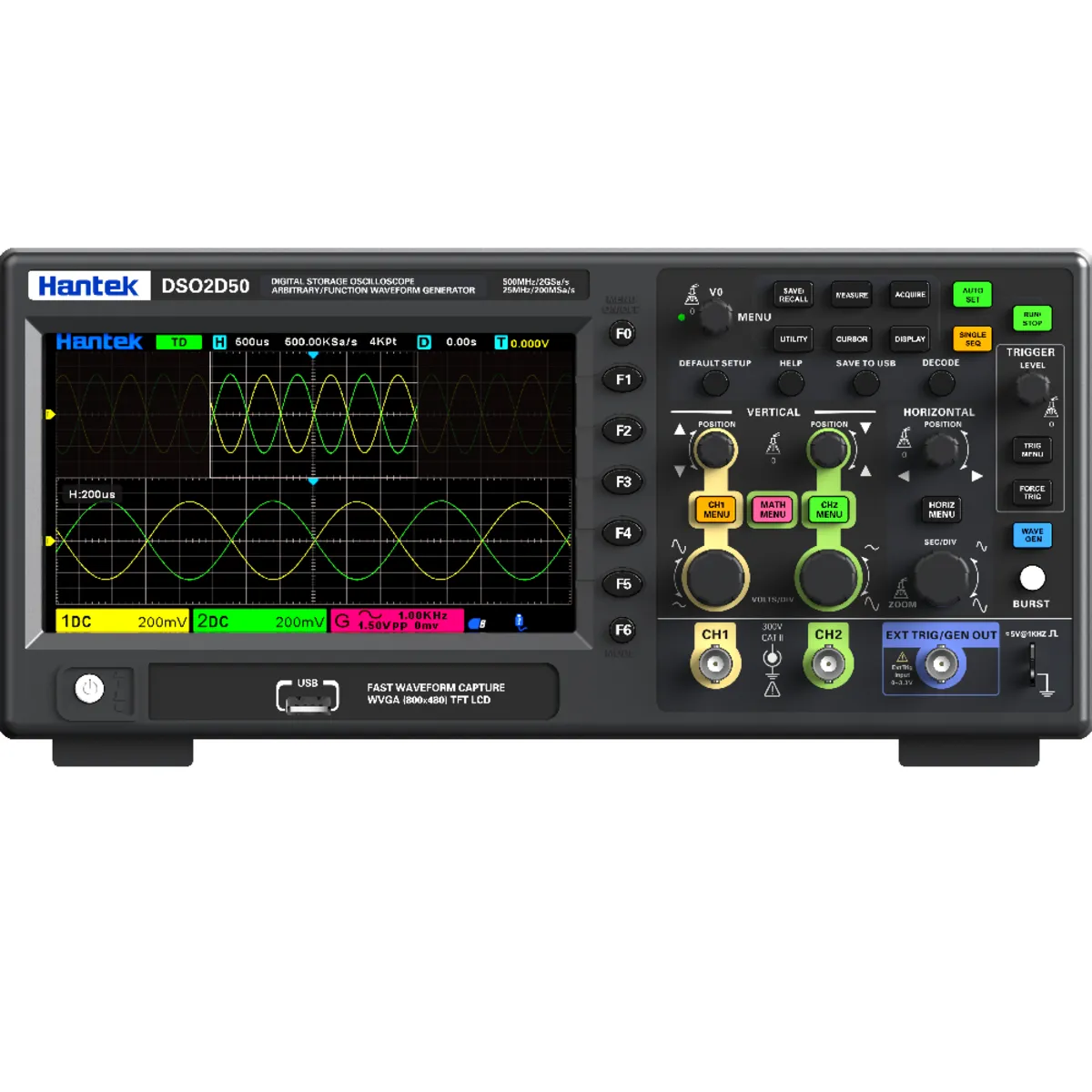 اسیلوسکوپ دیجیتال سری DSO2D20 دارای عملکردهای جامع و عملکرد فوق العاده ای است با نرخ نمونه برداری 2GSas و حداکثر پهنای باند 500 مگاهرتز در کل محدوده پشتیبانی از سوئیچینگ امپدانس1M/502 برای اطمینان از یکپارچگی سیگنال ژنراتور شکل موج دلخواه داخلی قادر به تولید 5 شکل موج استاندارد و پشتیبانی از خروجی شکل موج دلخواه سفارشی پیکربندی استاندارد شامل 9 حالت تریگر شامل لبه پالس ویدئو، شیب، زمان وقفه، پنجره الگوی کد فاصله و زیر دامنه و همچنین 5 تابع تحلیل گذرگاه و رمزگشایی پروتکل شامل UART LIN CAN SPI و IIC 32 تابع اندازه گیری خودکار و اندازه گیری آستانه با نتایج آزمایش که از تجزیه و تحلیل آماری پشتیبانی میکنند؛ دو مجموعه تابع ولت متر دیجیتال و توابع فرکانس سنج سخت افزاری
